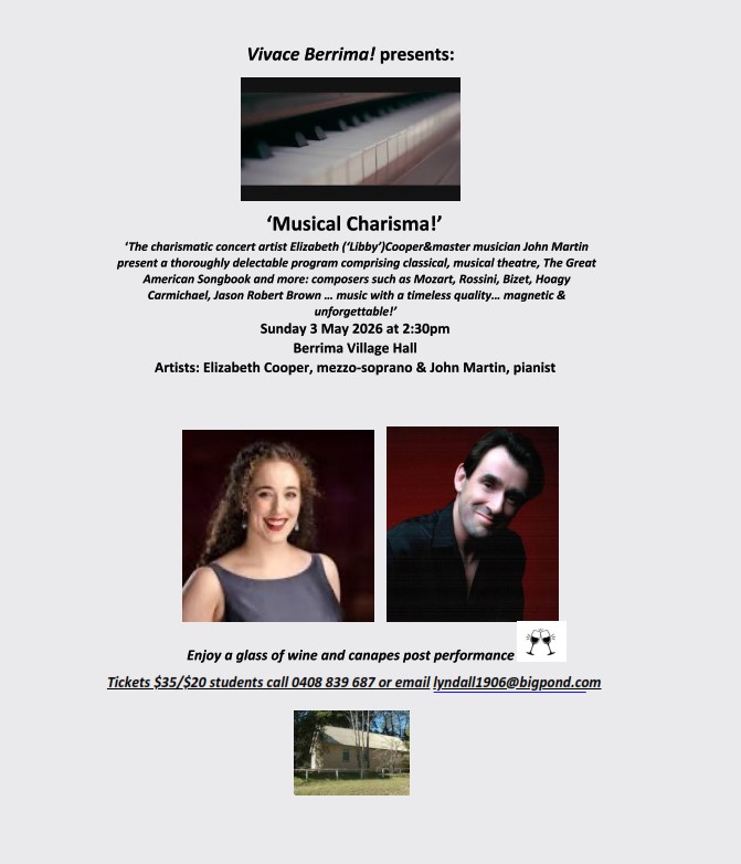 The charismatic concert artist Elizabeth (‘Libby’) Cooper & master musician John Martin present a thoroughly delectable program comprising classical, musical theatre, The Great American Songbook and more: composers such as Mozart, Rossini, Bizet, Hoagy Carmichael, Jason Robert Brown … music with a timeless quality … magnetic & unforgettable!