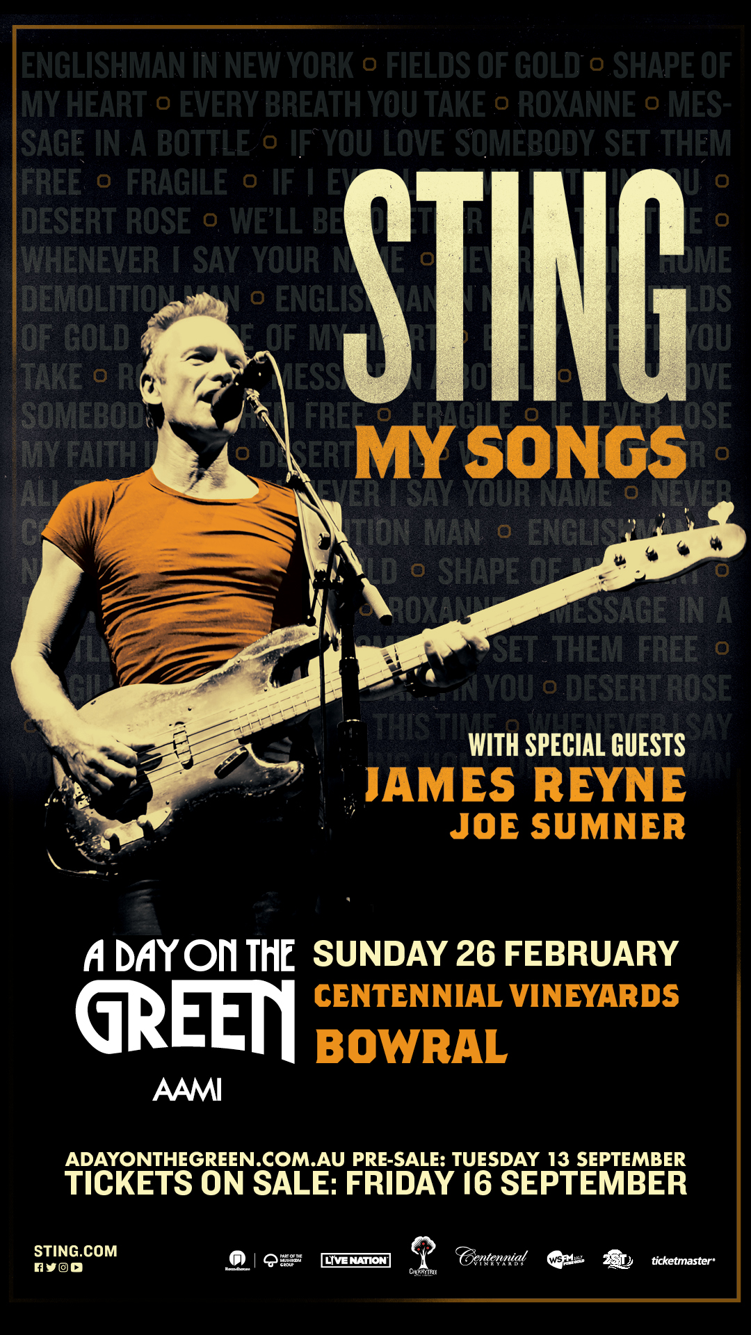 STING will be accompanied by an electric, rock emsemble, with special guest JOE SUMNER on his first Australian solo tour